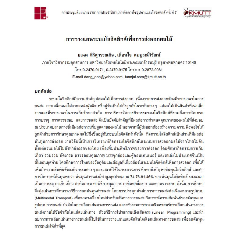 กลุ่มงานวิจัยและโครงการกลุ่มงานวิจัยงานวิจัยปี 2007 กลุ่มงานวิจัยและโครงการ: การวางแผนระบบโลจิสติกส์เพื่อการส่งออกผลไม้ 16/01/2019 1199 Facebook Twitter Google+ Pinterest WhatsApp การวางแผนระบบโลจิสติกส์เพื่อการส่งออกผลไม้ การวางแผนระบบโลจิสติกส์เพื่อการส่งออกผลไม้ ธเนศ สิริสุวรรณกิจ,เตือนใจ สมบูรณ์วิวัฒน์ >> Download ebook <<