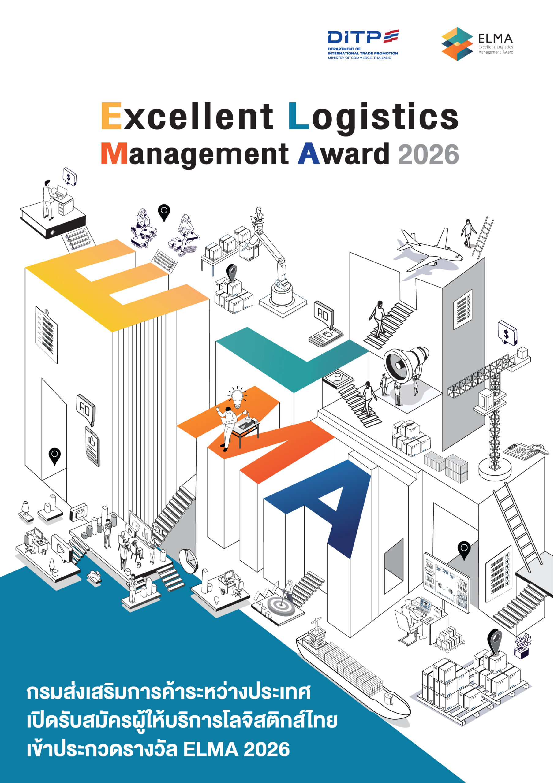 กรมส่งเสริมการค้าระหว่างประเทศ โดยสำนักพัฒนาและส่งเสริมธุรกิจบริการ ขอเชิญชวนผู้ประกอบการโลจิสติกส์ สมัครรับรางวัลผู้ประกอบการที่มีความเป็นเลิศด้านการบริหารจัดการโลจิสติกส์ ประจำปี 2569 (Excellent Logistics Management Award 2026) หรือ ELMA 2026 ตั้งแต่วันนี้ ถึงวันที่ 30 เมษายน 2569